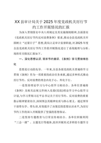 【七哥公文】2025年:XX县审计局关于2025年度党政机关厉行节约工作开展情况的汇报+更多免费公文+VX:QiGeGongWen2024