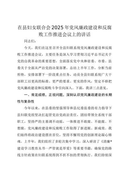 【七哥公文】2025年:在县妇女联合会2025年党风廉政建设和反腐败工作推进会议上的讲话+更多免费公文+VX:QiGeGongWen2024