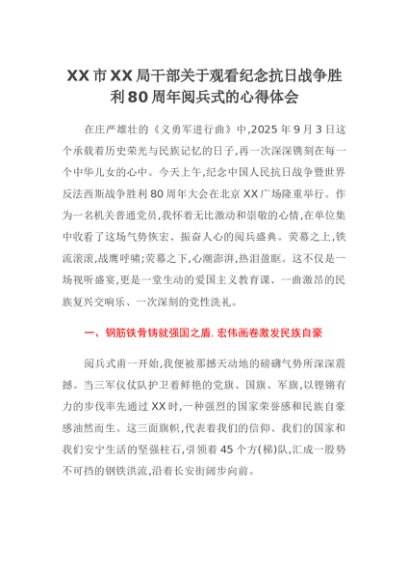 【七哥公文】2025年:XX市XX局干部关于观看纪念抗日战争胜利80周年阅兵式的心得体会+更多免费公文+VX:QiGeGongWen2024