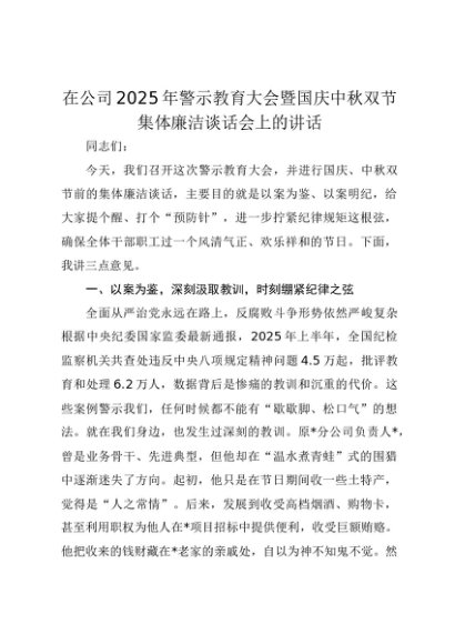 【七哥公文】2025年:在公司2025年警示教育大会暨国庆中秋双节集体廉洁谈话会上的讲话+更多免费公文+VX:QiGeGongWen2024