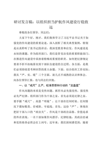 【七哥公文】2025年:研讨发言稿:以组织担当护航作风建设行稳致远+更多免费公文+VX:QiGeGongWen2024