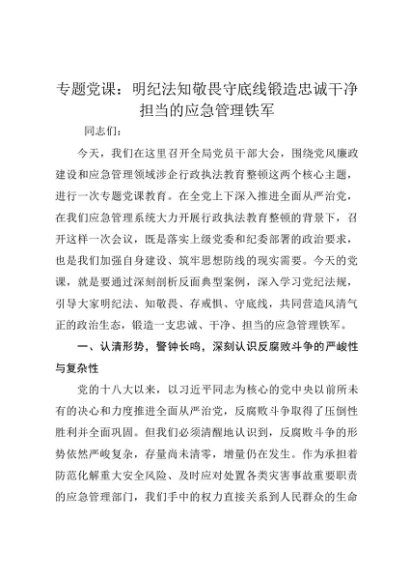 【七哥公文】2025年:专题党课讲稿:明纪法知敬畏守底线 锻造忠诚干净担当的应急管理铁军+更多免费公文+VX:QiGeGongWen2024