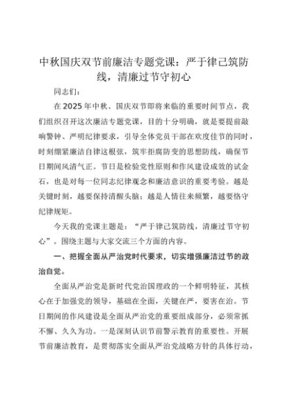 【七哥公文】2025年:中秋国庆双节前廉洁专题党课讲稿:严于律己筑防线,清廉过节守初心+更多免费公文+VX:QiGeGongWen2024