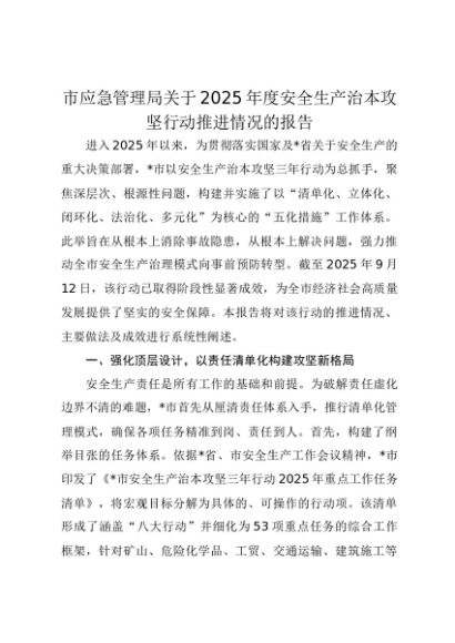 【七哥公文】2025年:市应急管理局关于2025年度安全生产治本攻坚行动推进情况的报告+更多免费公文+VX:QiGeGongWen2024