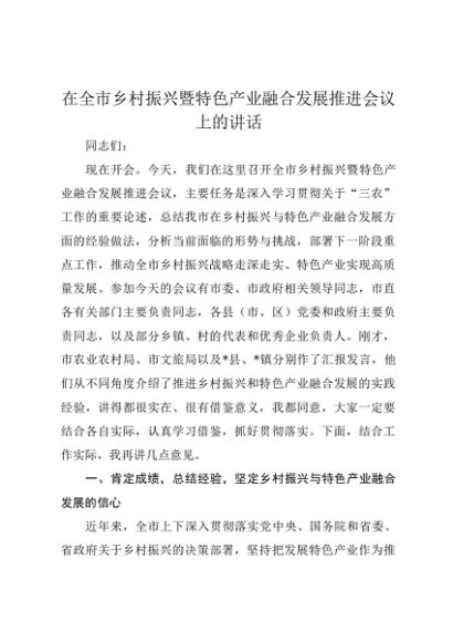 【七哥公文】2025年:在全市乡村振兴暨特色产业融合发展推进会议上的讲话+更多免费公文+VX:QiGeGongWen2024