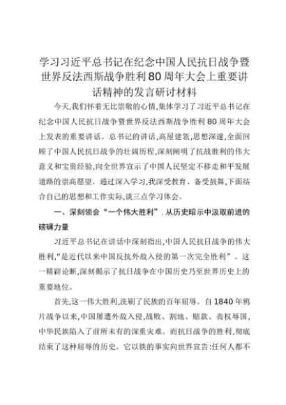 【七哥公文】2025年:学习习近平总书记在纪念中国人民抗日战争暨世界反法西斯战争胜利80周年大会上重要讲话精神的发言研讨材料+更多免费公文+VX:QiGeGongWen2024