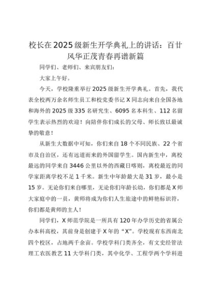 【七哥公文】2025年:校长在2025级新生开学典礼上的讲话:百廿风华正茂青春再谱新篇+更多免费公文+VX:QiGeGongWen2024