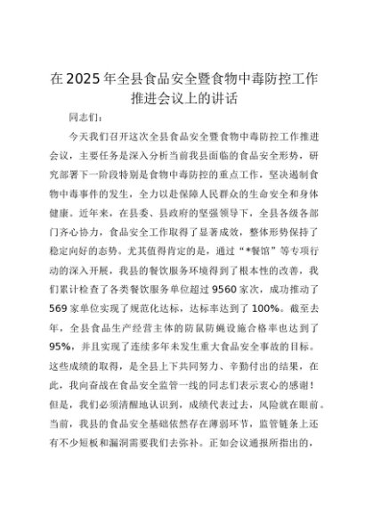 【七哥公文】2025年:在2025年全县食品安全暨食物中毒防控工作推进会议上的讲话+更多免费公文+VX:QiGeGongWen2024