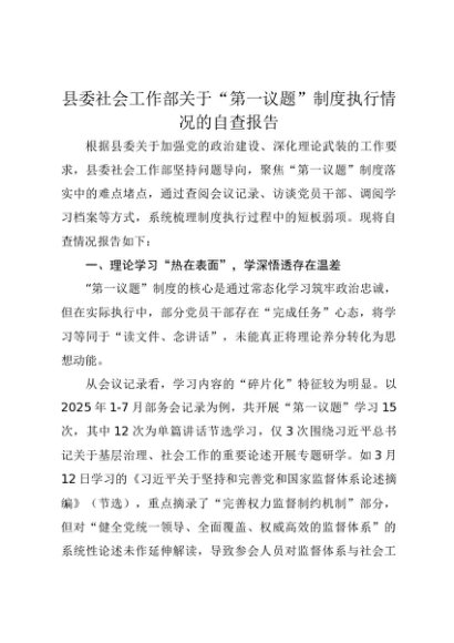 【七哥公文】2025年:县委社会工作部关于“第一议题”制度执行情况的自查报告+更多免费公文+VX:QiGeGongWen2024