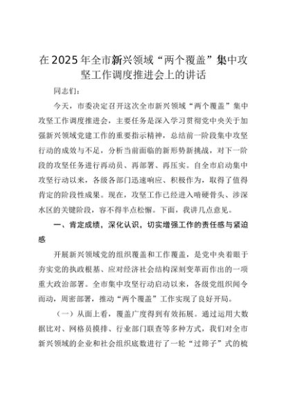 【七哥公文】2025年:在2025年全市新兴领域“两个覆盖”集中攻坚工作调度推进会上的讲话+更多免费公文+VX:QiGeGongWen2024