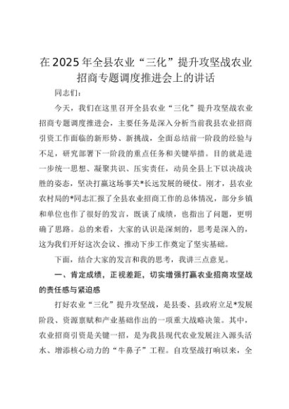 【七哥公文】2025年:在2025年全县农业“三化”提升攻坚战农业招商专题调度推进会上的讲话+更多免费公文+VX:QiGeGongWen2024