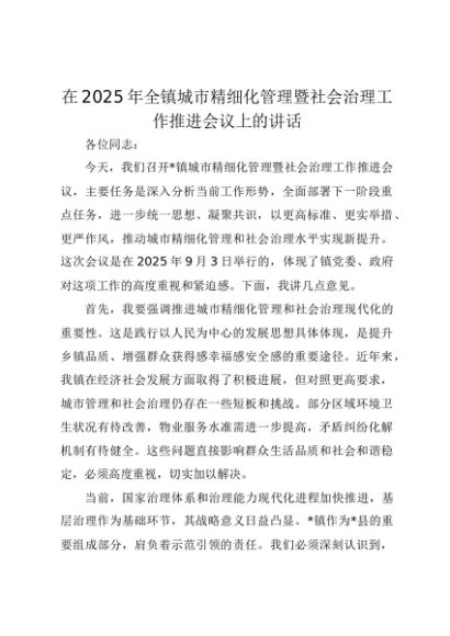 【七哥公文】2025年:在2025年全镇城市精细化管理暨社会治理工作推进会议上的讲话+更多免费公文+VX:QiGeGongWen2024