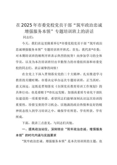 【七哥公文】2025年:在2025年市委党校党员干部“筑牢政治忠诚增强服务本领”专题培训班上的讲话+更多免费公文+VX:QiGeGongWen2024