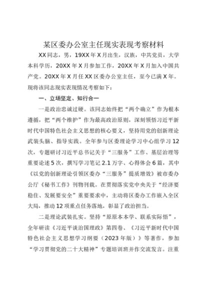 / 【七哥公文】2025年:某区委办公室主任现实表现考察材料+更多免费公文+VX:QiGeGongWen2024