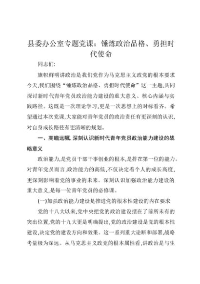 【七哥公文】2025年:县委办公室专题党课讲稿:锤炼政治品格、勇担时代使命+更多免费公文+VX:QiGeGongWen2024