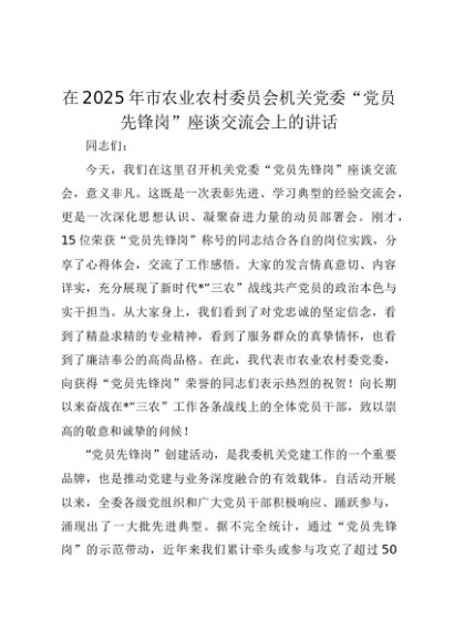 【七哥公文】2025年:在2025年市农业农村委员会机关党委“党员先锋岗”座谈交流会上的讲话+更多免费公文+VX:QiGeGongWen2024