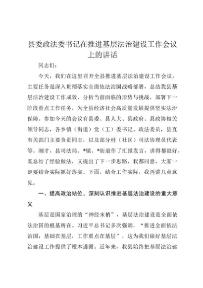 【七哥公文】2025年:县委政法委书记在推进基层法治建设工作会议上的讲话+更多免费公文+VX:QiGeGongWen2024