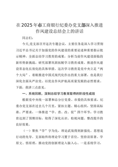 【七哥公文】2025年:在2025年市工商银行纪委办党支部深入推进作风建设总结会上的讲话+更多免费公文+VX:QiGeGongWen2024