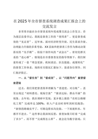 【七哥公文】2025年:在2025年全市督查系统调查成果汇报会上的交流发言+更多免费公文+VX:QiGeGongWen2024