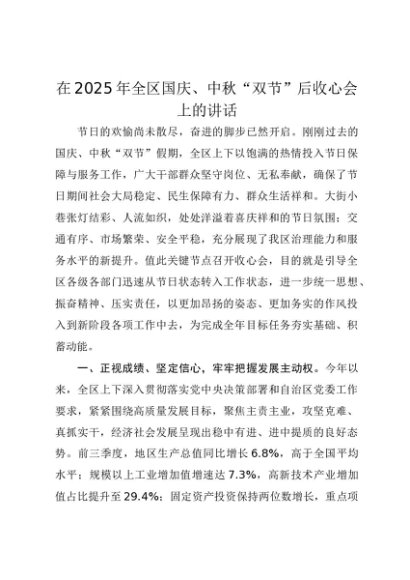 【七哥公文】2025年:在2025年全区国庆、中秋“双节”后收心会上的讲话+更多免费公文+VX:QiGeGongWen2024