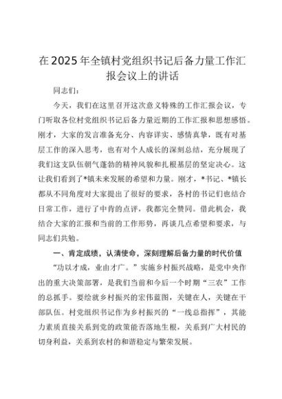 【七哥公文】2025年:在2025年全镇村党组织书记后备力量工作汇报会议上的讲话+更多免费公文+VX:QiGeGongWen2024