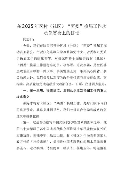 【七哥公文】2025年:在2025年区村(社区)“两委”换届工作动员部署会上的讲话+更多免费公文+VX:QiGeGongWen2024