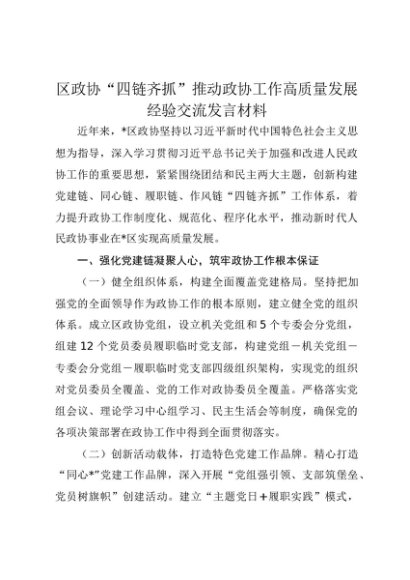 【七哥公文】2025年:区政协“四链齐抓”推动政协工作高质量发展经验交流发言材料+更多免费公文+VX:QiGeGongWen2024