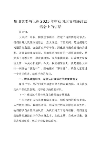 【七哥公文】2025年:集团党委书记在2025年中秋国庆节前廉政谈话会上的讲话+更多免费公文+VX:QiGeGongWen2024
