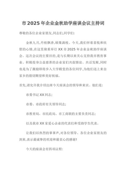 / 【七哥公文】2025年:市2025年企业金秋助学座谈会议主持词+更多免费公文+VX:QiGeGongWen2024