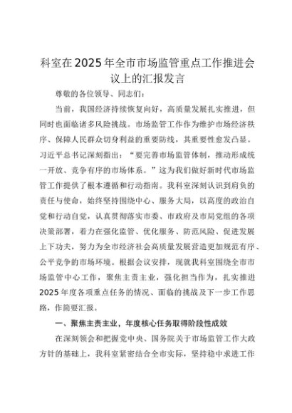 【七哥公文】2025年:科室在2025年全市市场监管重点工作推进会议上的汇报发言+更多免费公文+VX:QiGeGongWen2024