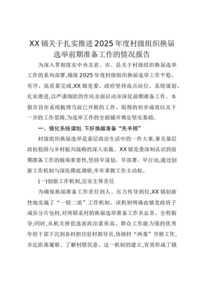 【七哥公文】2025年:XX镇关于扎实推进2025年度村级组织换届选举前期准备工作的情况报告+更多免费公文+VX:QiGeGongWen2024