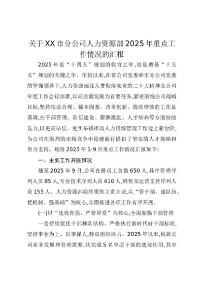 【七哥公文】2025年:关于XX市分公司人力资源部2025年重点工作情况的汇报+更多免费公文+VX:QiGeGongWen2024