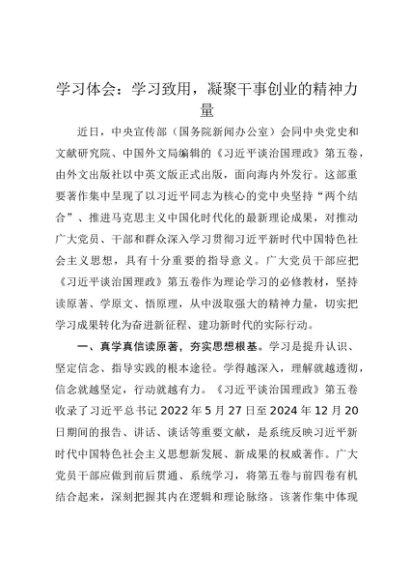 【七哥公文】2025年:《治国理政》第五卷学习心得体会:学习致用,凝聚干事创业的精神力量+更多免费公文+VX:QiGeGongWen2024