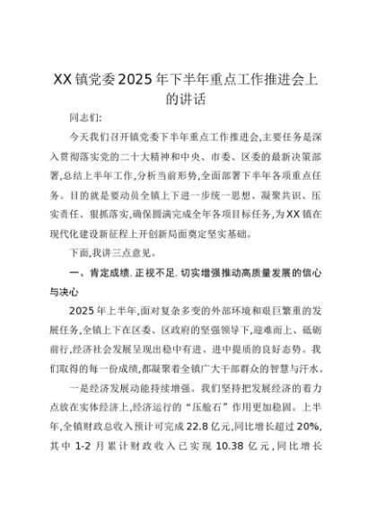 【七哥公文】2025年:XX镇党委2025年下半年重点工作推进会上的讲话+更多免费公文+VX:QiGeGongWen2024