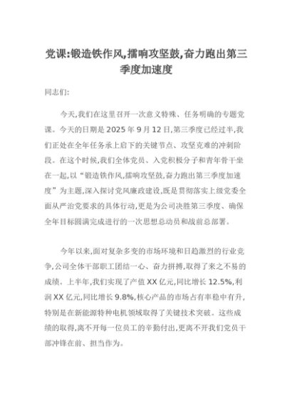 【七哥公文】2025年:党课讲稿:锻造铁作风,擂响攻坚鼓,奋力跑出第三季度加速度+更多免费公文+VX:QiGeGongWen2024