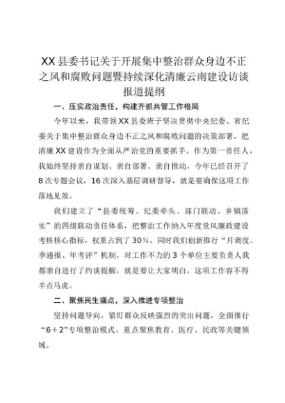 【七哥公文】2025年:XX县委书记关于开展集中整治群众身边不正之风和腐败问题暨持续深化清廉云南建设访谈报道提纲+更多免费公文+VX:QiGeGongWen2024