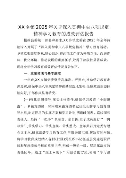 【七哥公文】2025年:XX乡镇2025年关于深入贯彻中央八项规定精神学习教育的成效评估报告+更多免费公文+VX:QiGeGongWen2024