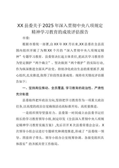 【七哥公文】2025年:XX县委关于2025年深入贯彻中央八项规定精神学习教育的成效评估报告+更多免费公文+VX:QiGeGongWen2024