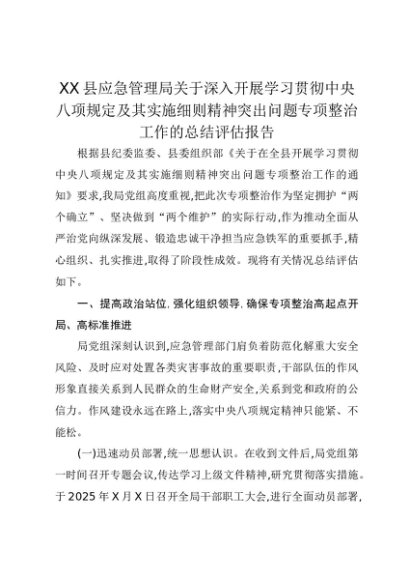 【七哥公文】2025年:XX县应急管理局关于深入开展学习贯彻中央八项规定及其实施细则精神突出问题专项整治工作的总结评估报告+更多免费公文+VX:QiGeGongWen2024