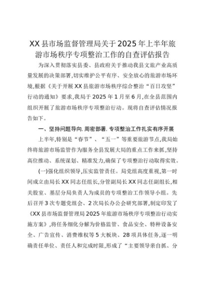 【七哥公文】2025年:XX县市场监督管理局关于2025年上半年旅游市场秩序专项整治工作的自查评估报告+更多免费公文+VX:QiGeGongWen2024