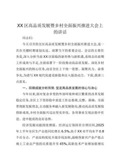 / 【七哥公文】2025年:XX区高品质发展暨乡村全面振兴推进大会上的讲话+更多免费公文+VX:QiGeGongWen2024