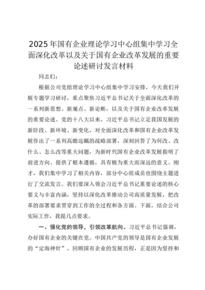 【七哥公文】2025年:2025年国有企业理论学习中心组集中学习全面深化改革以及关于国有企业改革发展的重要论述研讨发言材料+更多免费公文+VX:QiGeGongWen2024