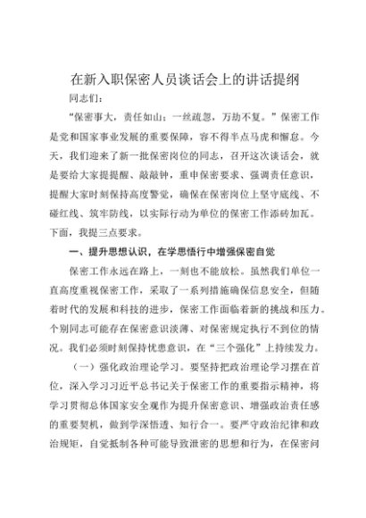 【七哥公文】2025年:在新入职保密人员谈话会上的讲话提纲+更多免费公文+VX:QiGeGongWen2024