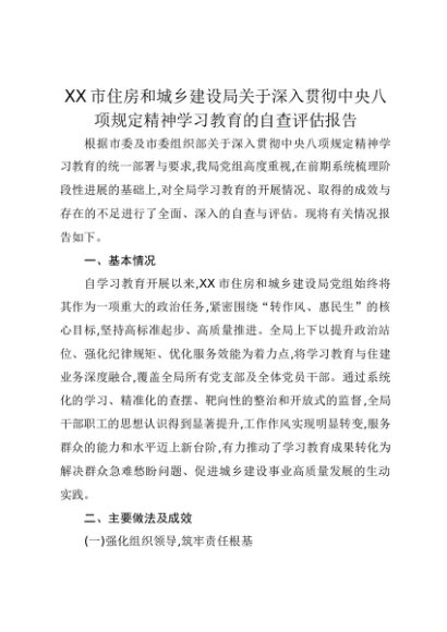 【七哥公文】2025年:XX市住房和城乡建设局关于深入贯彻中央八项规定精神学习教育的自查评估报告+更多免费公文+VX:QiGeGongWen2024