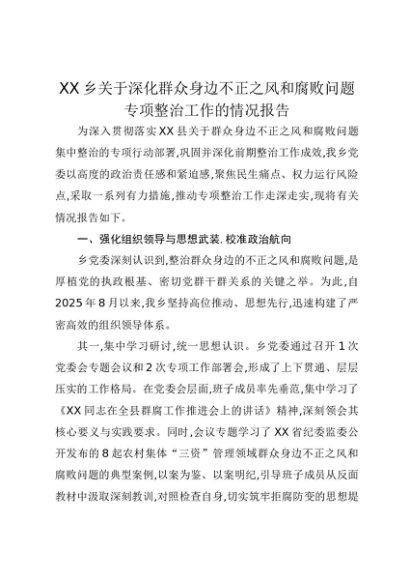 【七哥公文】2025年:XX乡关于深化群众身边不正之风和腐败问题专项整治工作的情况报告+更多免费公文+VX:QiGeGongWen2024