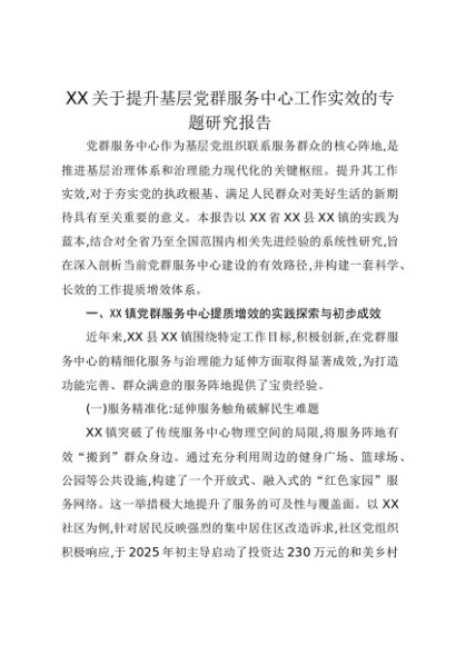 【七哥公文】2025年:XX关于提升基层党群服务中心工作实效的专题研究报告+更多免费公文+VX:QiGeGongWen2024
