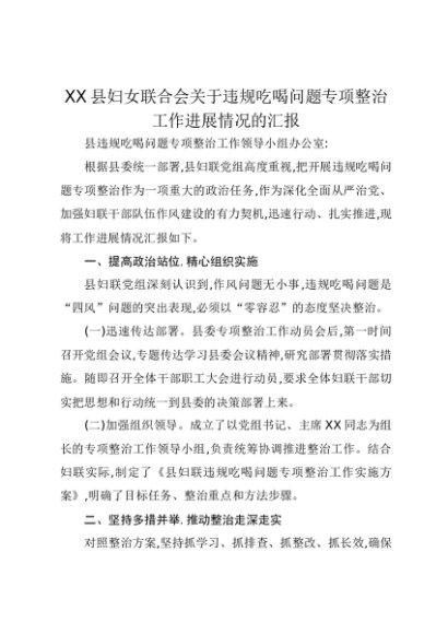 【七哥公文】2025年:XX县妇女联合会关于违规吃喝问题专项整治工作进展情况的汇报+更多免费公文+VX:QiGeGongWen2024