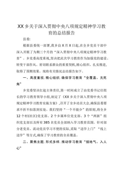 【七哥公文】2025年:XX乡关于深入贯彻中央八项规定精神学习教育的总结报告+更多免费公文+VX:QiGeGongWen2024