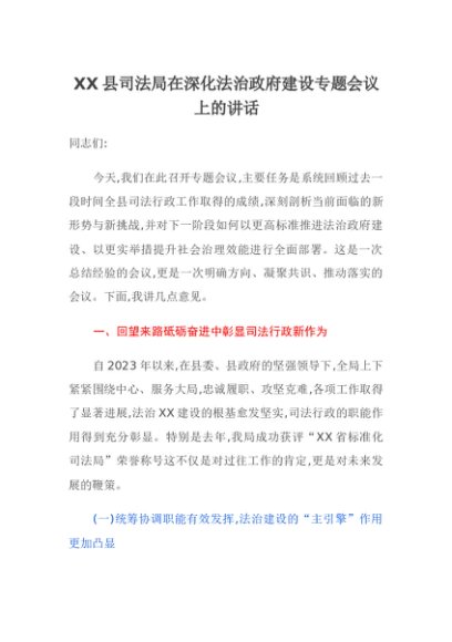 / 【七哥公文】2025年:XX县司法局在深化法治政府建设专题会议上的讲话+更多免费公文+VX:QiGeGongWen2024