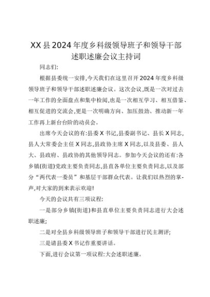 【七哥公文】2025年:XX县2024年度乡科级领导班子和领导干部述职述廉会议主持词+更多免费公文+VX:QiGeGongWen2024